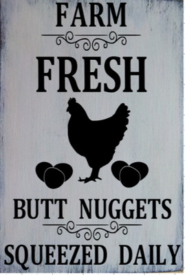 Have several different types of eggs and can even offer fresh or frozen chickens for cooking if given notice!!This item Mora color Farm Fresh Butt Nuggets tin Sign Vintage Metal Pub Club Cafe bar Home Wall Art Decoration Poster Retro 8x12 inches Bigtime Signs Beware of Tiny Raptors Funny Chicken Coop, Farm, Home, Kitchen, Outdoor, Rooster/Hen House Decoration 2 holes for Easy Hanging, Strong PVC Material Silly Decor 12 x 12 inchDescription Farm Fresh Butt Nuggets This listing is for a PDF digital download of a cross stitch pattern No physical product will be mailed to you This pattern is designed for 14 count Aida cross stitch fabric and will turn out as a seven inch square and uses 4 different color threads